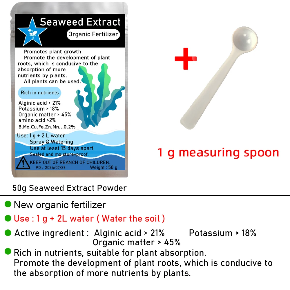 Active ingredient: Alginic acid > 21% Potassium > 18% Organic matter > 45% Amino acid >2% Betaine >0.2% Mannitol >0.5% B.Mo.Cu.Fe.Zn.Mn.. >0.2%
