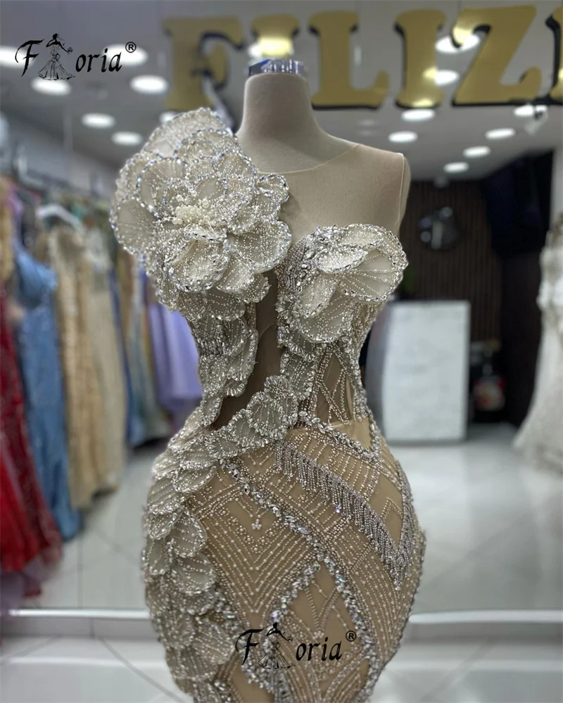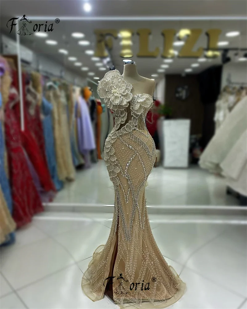 Luxury Champagne Heavy 3D Flower Modelling Evening Dresses Woman Elegant Beaded Crystal Mermaid vestido de noche Wedding Party