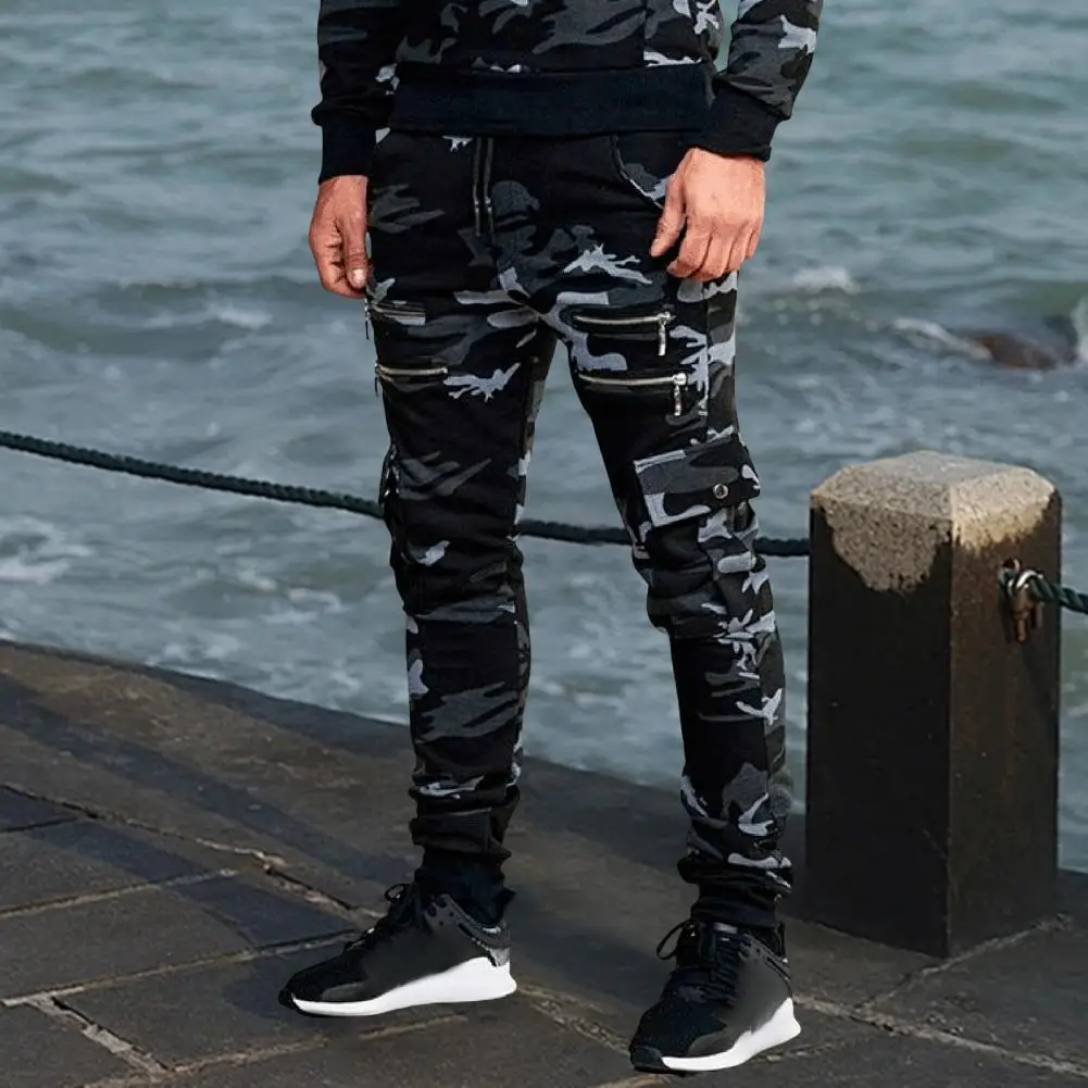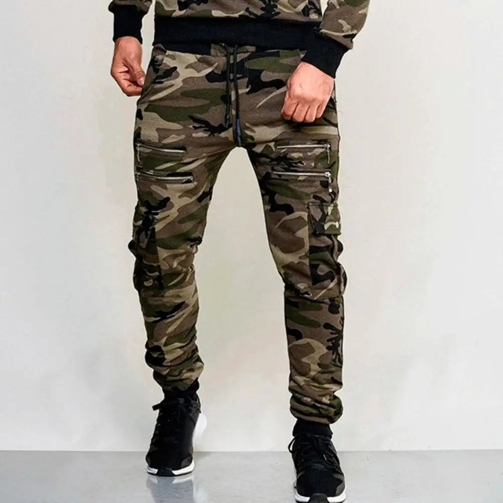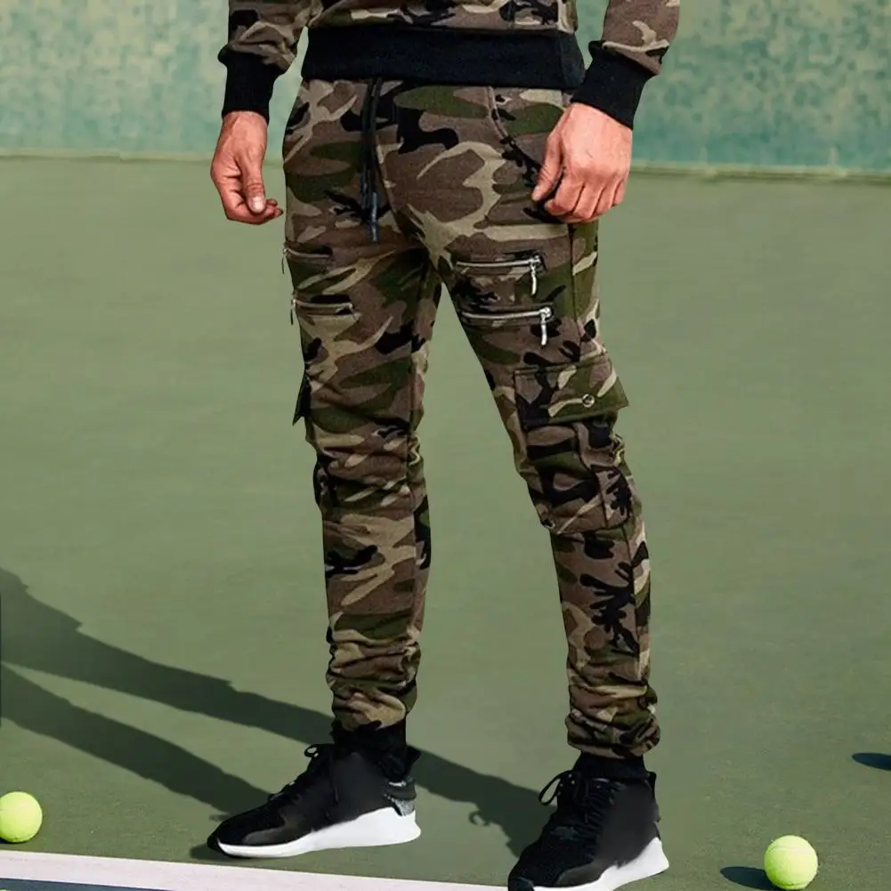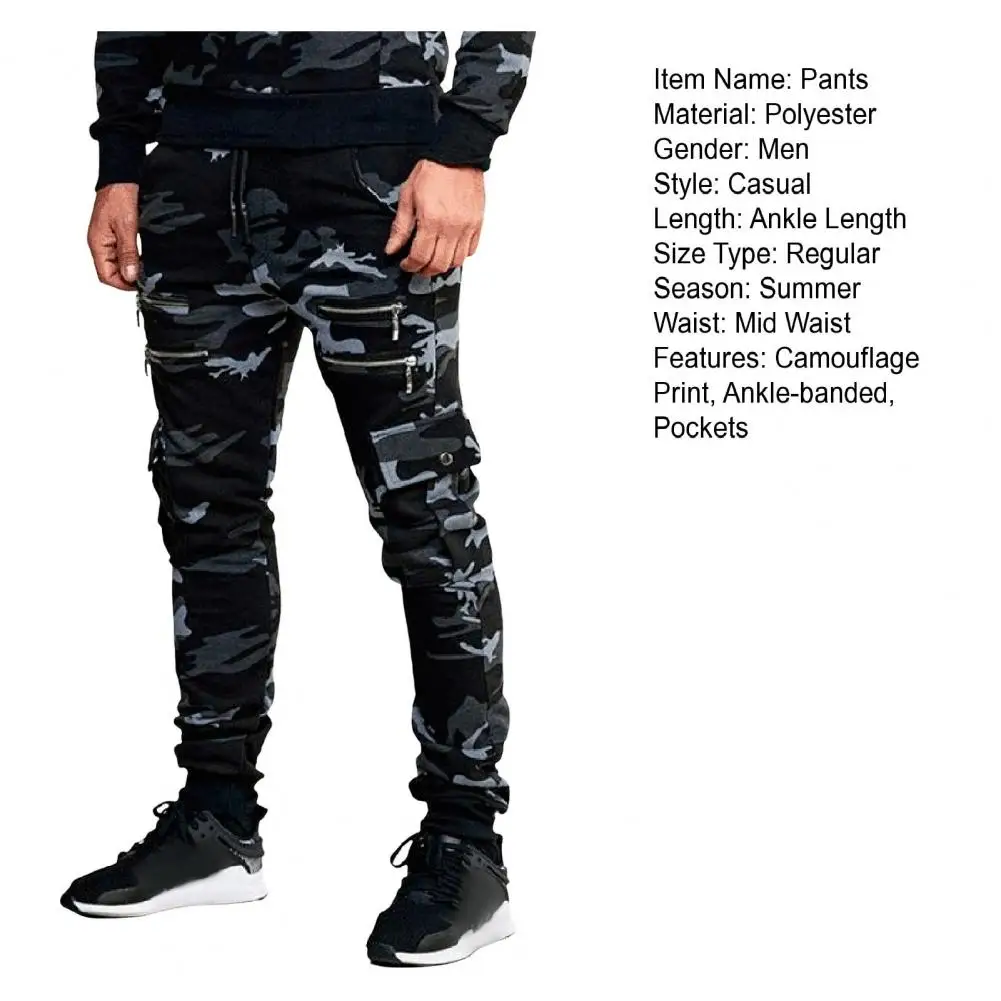 Men Cargo Pants Drawstring Elastic Waist Camouflage Print Multi Zippered Pockets Ankle-banded Slim Fit Casual Daily Wear Long Outdoor Trouser