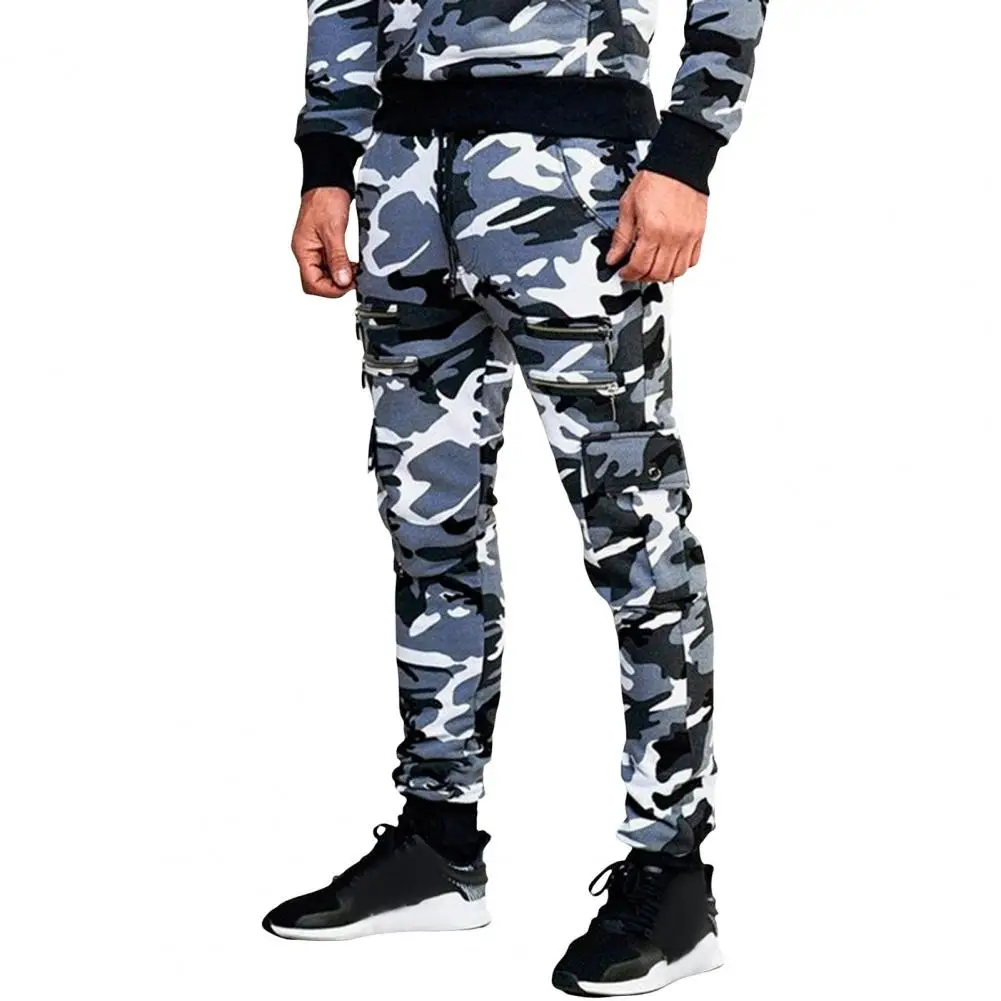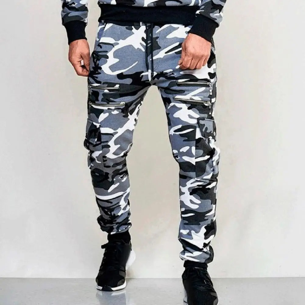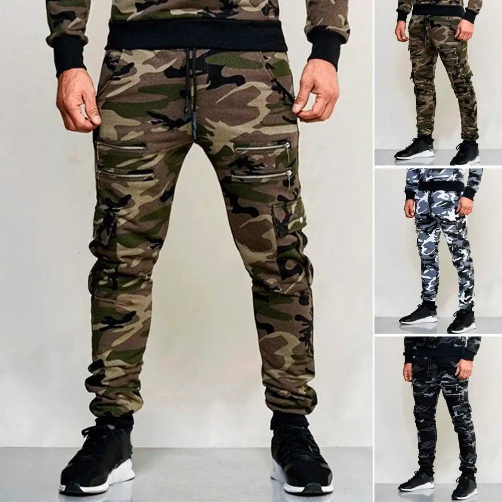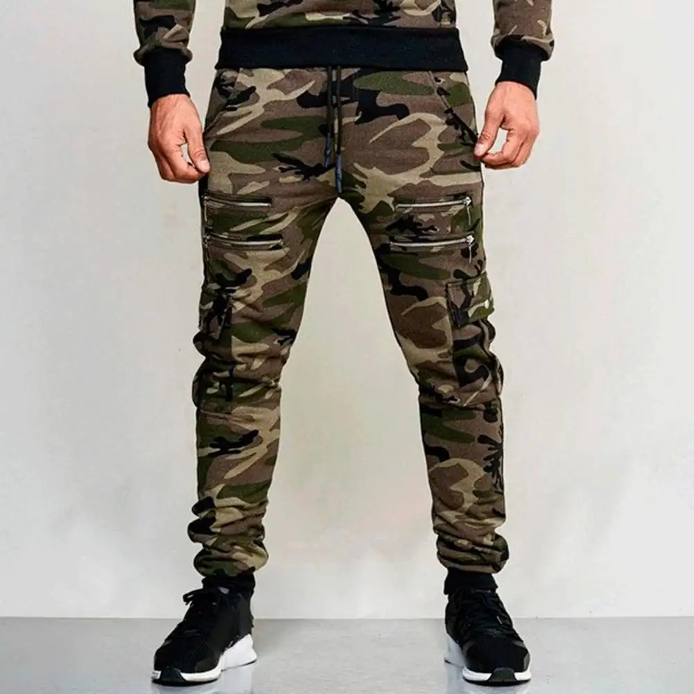 Men Cargo Pants Drawstring Elastic Waist Camouflage Print Multi Zippered Pockets Ankle-banded Slim Fit Casual Daily Wear Long Outdoor Trouser